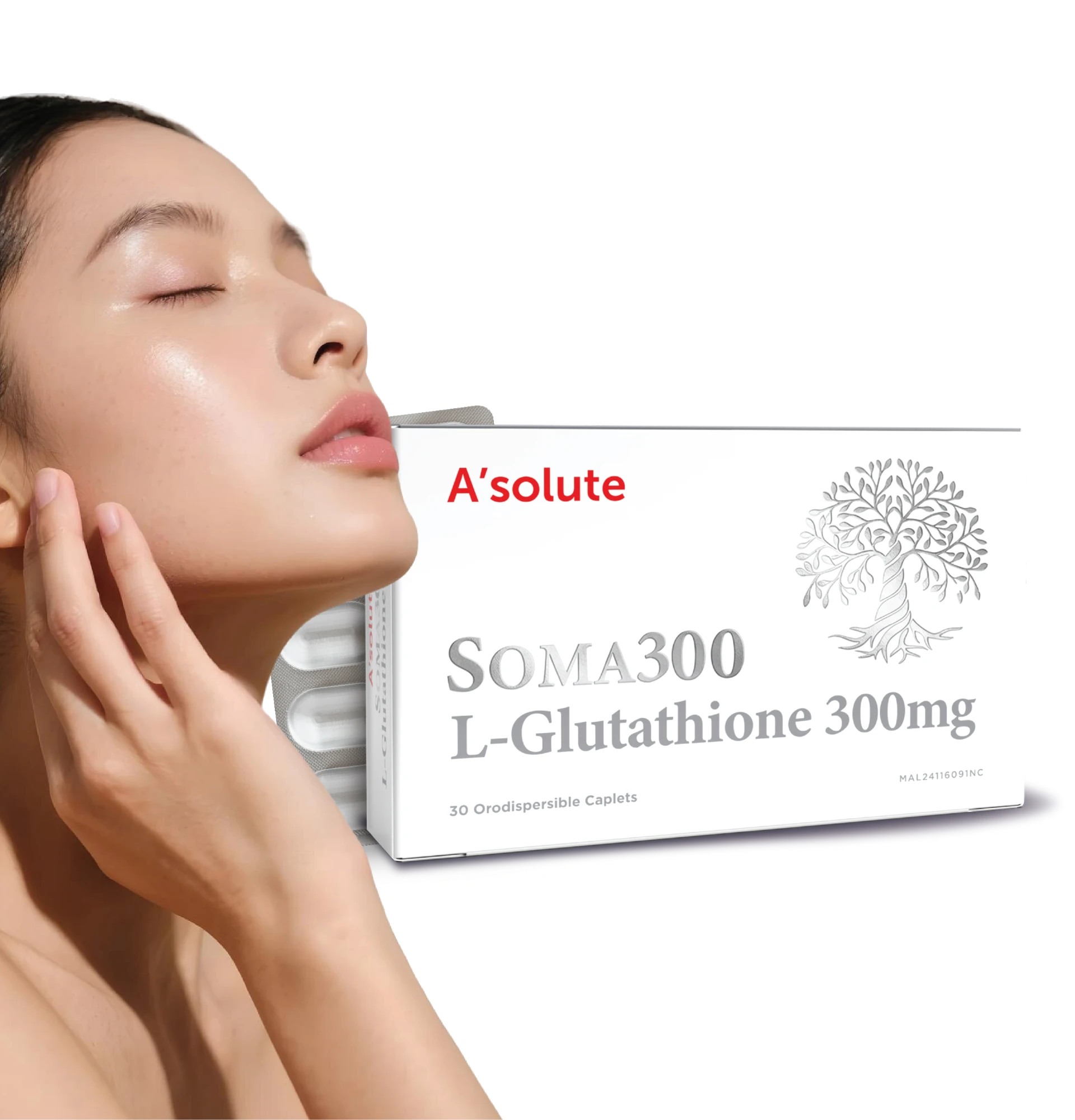 A’solute SOMA300 supports radiant skin and detox health in one easy-to-take caplet. Formulated with premium Japanese L-Glutathione and manufactured under strict quality standards.